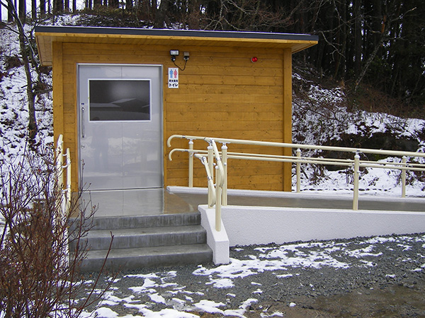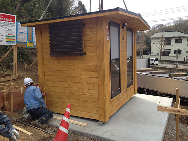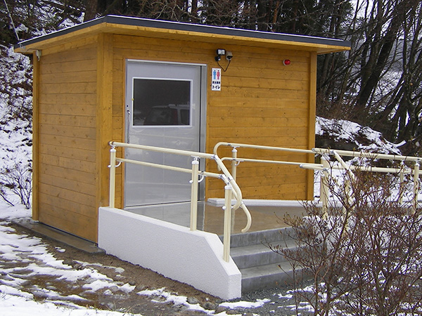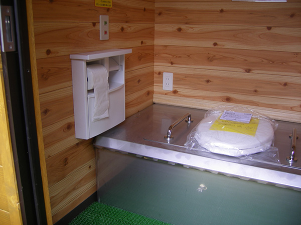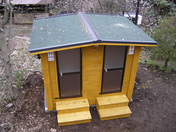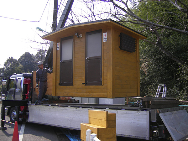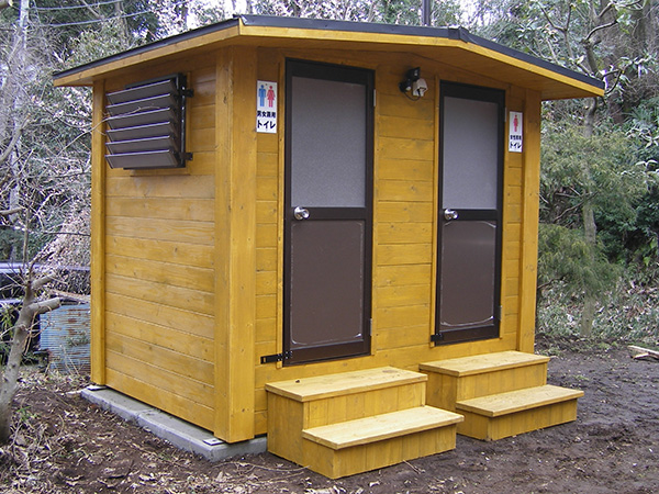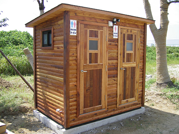耐腐食処理をしたSPF材を組み上げてログ調の外壁に仕上げたトイレです。自然の景観にマッチするデザインです。こちらのトイレも建物全体を当社の工場で製作し、完成した状態でユニックトラックに積んで現地に運び設置します。全体の重量が重くなりますので、常設トイレとして利用されることが多いようです。