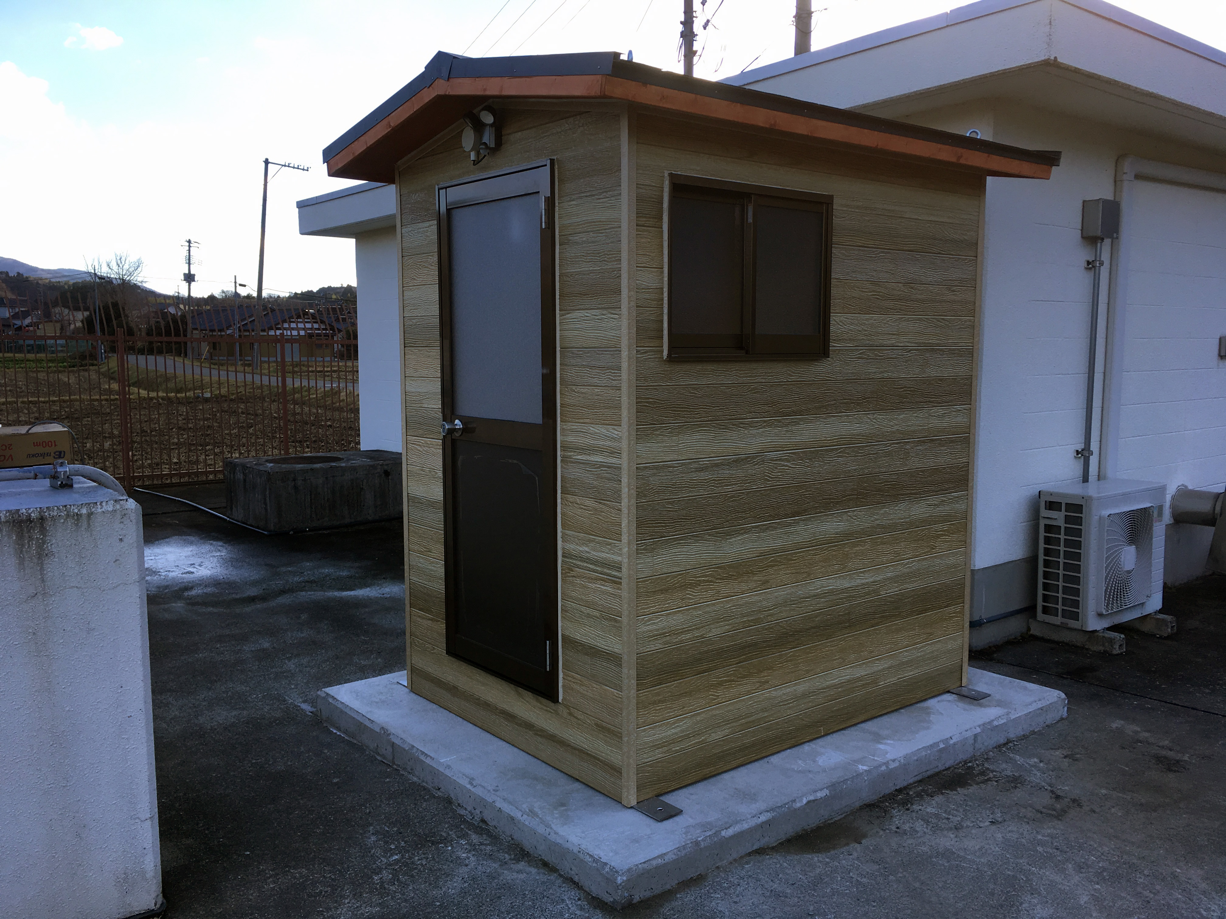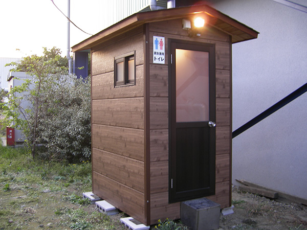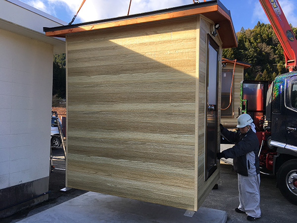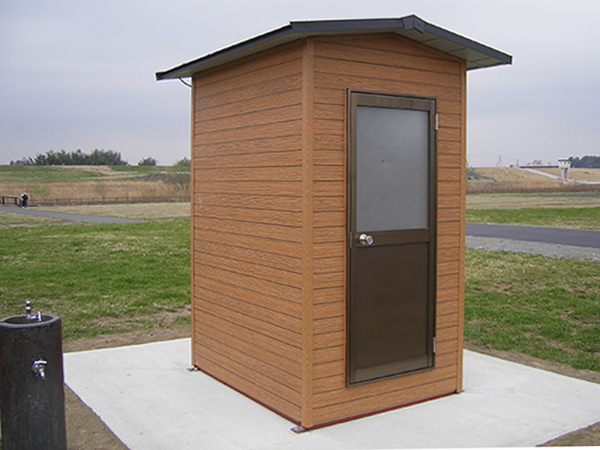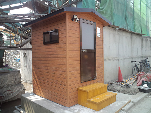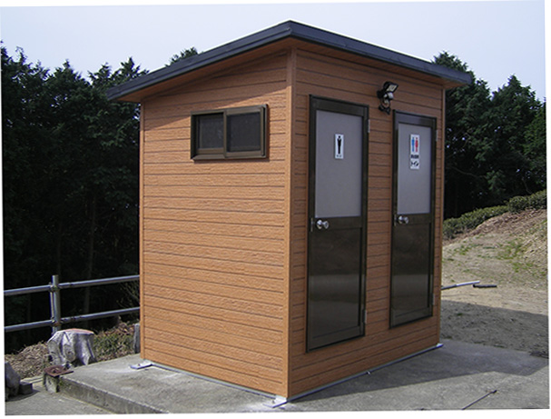 木目調のサイディングを使用した簡易トイレです。外壁が金属サイディングですので、雨風による腐食が無くメンテナンス性に優れています。建物全体を当社の工場で製作し、完成した状態でユニックトラックに積んで現地に運び設置します。ですので、現場での施工作業はとても簡単に済ますことができます。